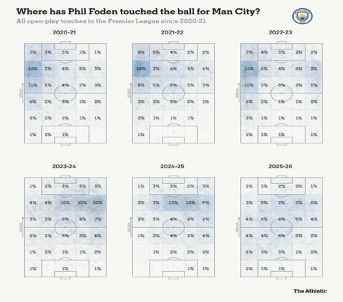他有过几次担任中路的时期,但他必须等到本赛季,瓜迪奥拉才相信他已准备好完全承担这份责任。十年循序渐进的指导,最终促成了曼城所期望的“完全体”福登的出现。