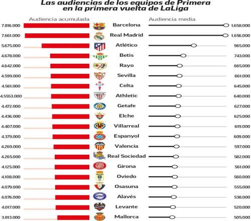 据《马卡报》报道,巴萨在电视收视市场上占据主导地位,上半赛季其联赛收视率排名领先。