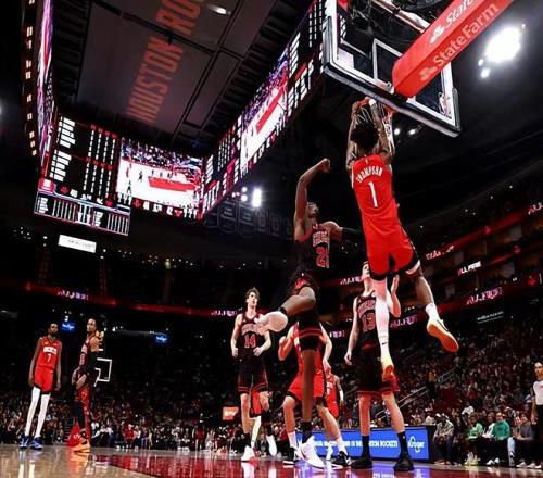 本场比赛中,火箭的先发控卫阿门-汤普森(Amen Thompson)的表现依然是令人喜忧参半。阿门全场出场42分26秒,投篮10中6,三分线外2中1,罚球10中10,得到了23分5篮板2助攻2抢断的数据,还有3次失误和3次犯规,正负值为-2。阿门在进攻端依然是展现出了出色的冲击力和爆发力并且对对手的内线制造了巨大的威胁。不仅如此,他还命中了一记三分,而且他在罚球线上的表现也是相当稳定的。除此之外,阿门也展现出了不俗的防守能力,在防守端起到了一定的作用。只是问题就在于,阿门在传球和组织方面的表现依然很不理想,他也是球队先发阵容中唯一一个正负值为负数的球员,这也能够说明他在场上时球队的局面很不理想,而在他没有出场的5分多钟时间内,火箭却反而赢了公牛8分,阿门不在时火箭的进攻反而变得更加流畅了。